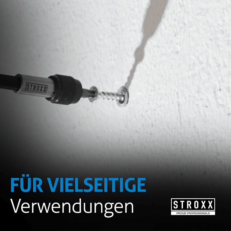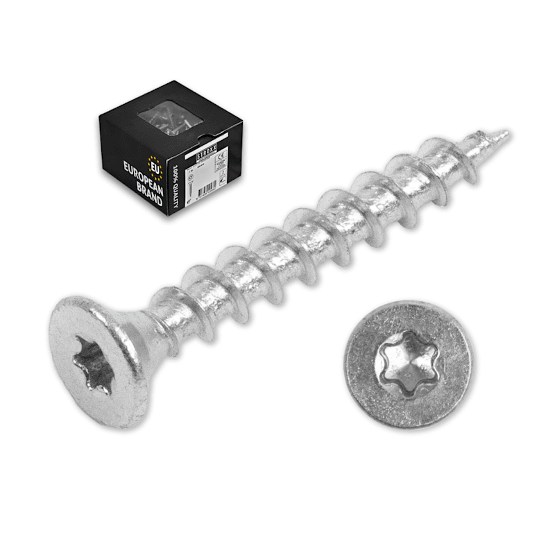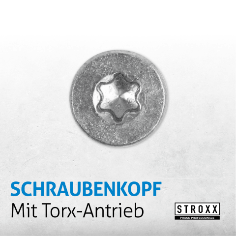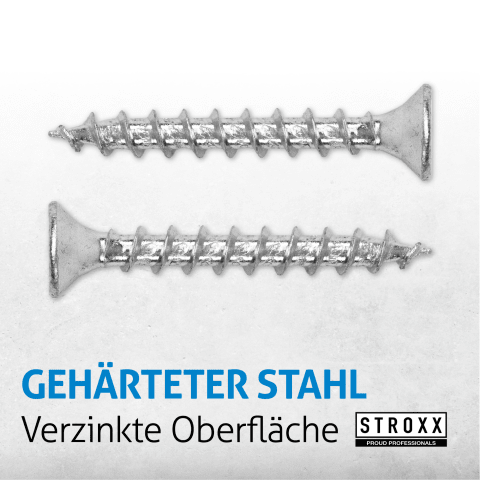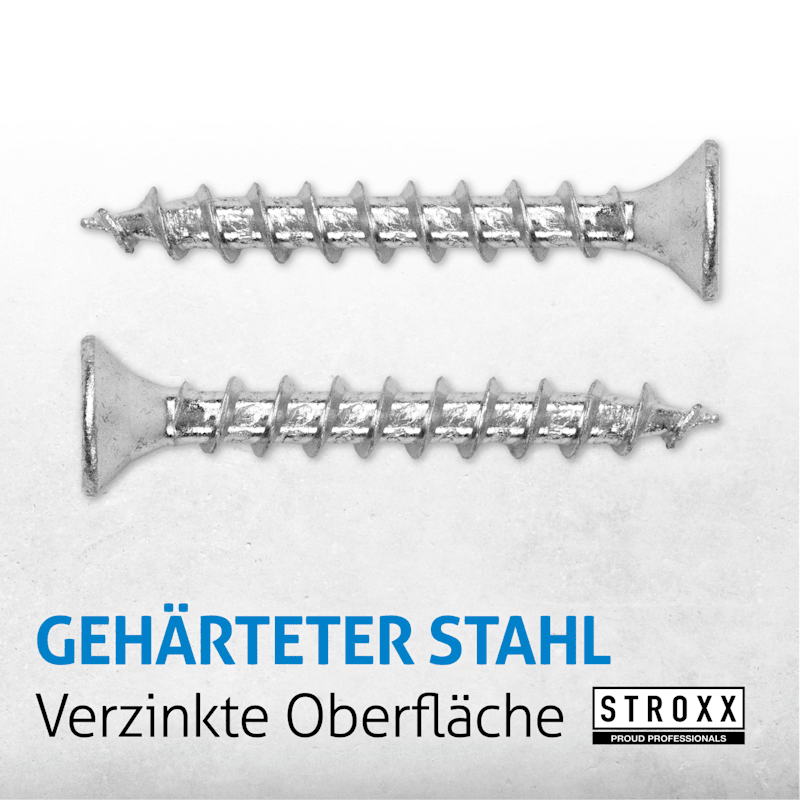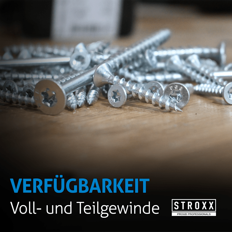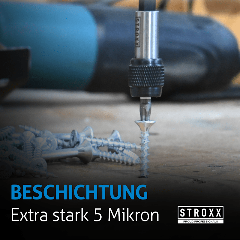 STROXX HOLZSCHRAUBEN mit 5 Mikron Beschichtungsdicke, tiefen Aussparungen, Stahl 10B21 gemäß EN14592. Erhältlich in verschiedenen Abmessungen mit Vollgewinde für vielseitige Verwendung.