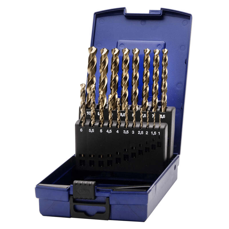 Hochwertiges HSS-Spiralbohrer-Set nach DIN 338 StandardEnthält 19 Teile mit einem Durchmesser von 1-10,0 mm in 0,5 mm Schritten.Hergestellt aus HSS (Hochleistungs-Schnellstahl) mit ECO5-Beschichtung f