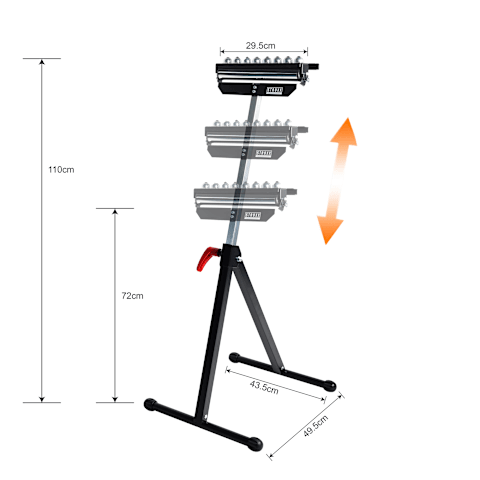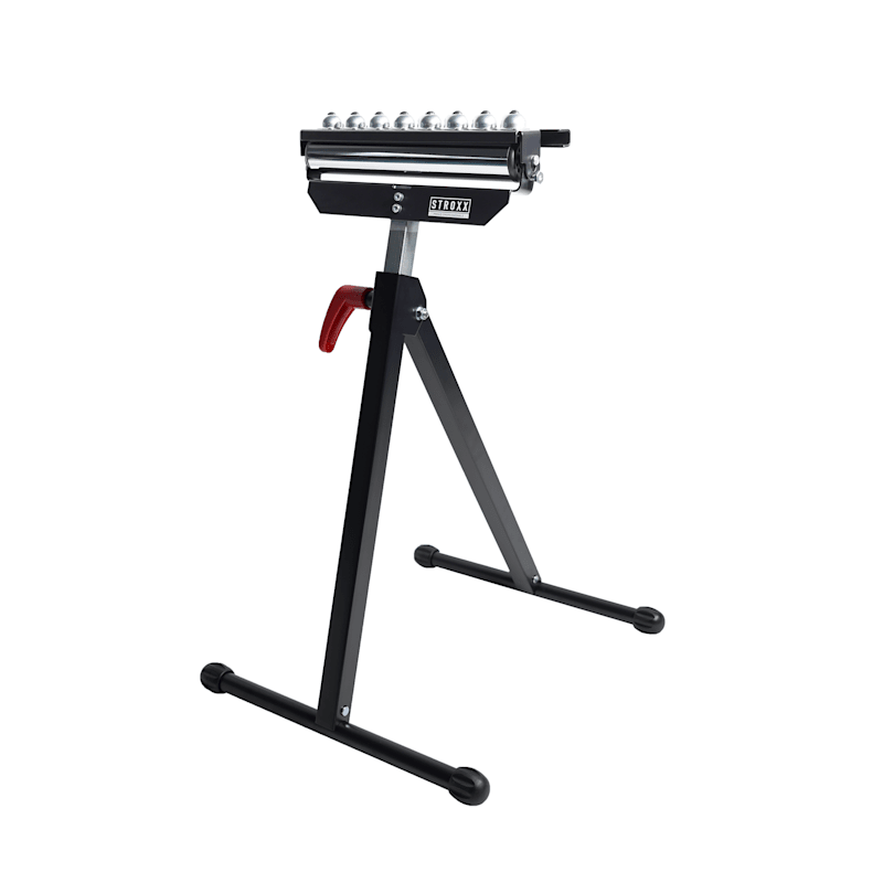 Der STROXX Rollenbock unterstützt Sie zuverlässig bei der Bearbeitung großer oder langer Werkstücke, insbesondere in Längsrichtung. Die kugelgelagerte Rolle mit 29,5 cm Breite sorgt für leichtgängigen Materiallauf. Durch die stufenlose Höhenverstellung von 72 bis 110 cm passen Sie den Rollenbock flexibel an Ihre Arbeitshöhe an. Verzinkte Rollen und ein stabiler pulverbeschichteter Rahmen gewährleisten eine hohe Belastbarkeit und lange Lebensdauer. Für sicheren Stand sorgen Gummifüße, der Verriegelungsgriff ermöglicht eine einfache Handhabung, und die klappbare Konstruktion erleichtert die Aufbewahrung.
