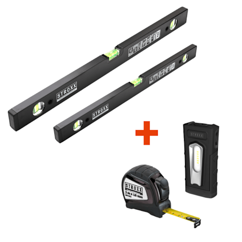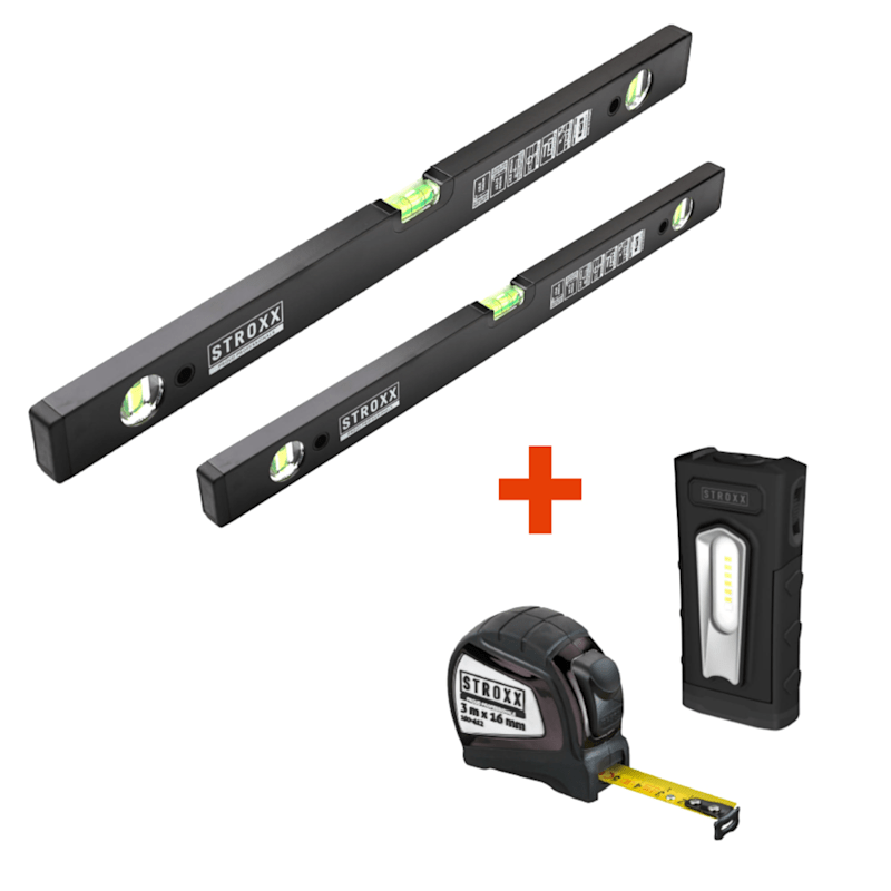 Das STROXX Wasserwaagen-Set bietet Ihnen präzises Messen und zuverlässige Beleuchtung für den täglichen Einsatz. Die beiden Wasserwaagen in den Längen 80cm & 180cm im schwarzen STROXX Design verfügen über eine Genauigkeit von 0,5–0,75 mm/m, sind schlagfest, UV-beständig und mit 30 Jahren Garantie auf die Libelle ausgestattet. Ergänzt wird das Set durch ein 3-m-Maßband mit feststellbarer, nylonbeschichteter Skala für hohe Abriebfestigkeit und blendfreie Ablesbarkeit. Die kompakte Arbeitslampe mit 500 Lumen, Drehgelenk, Magnet und Haken sorgt für flexible Ausleuchtung auch in engen Bereichen.