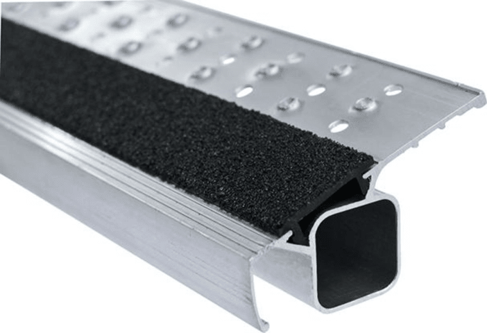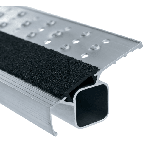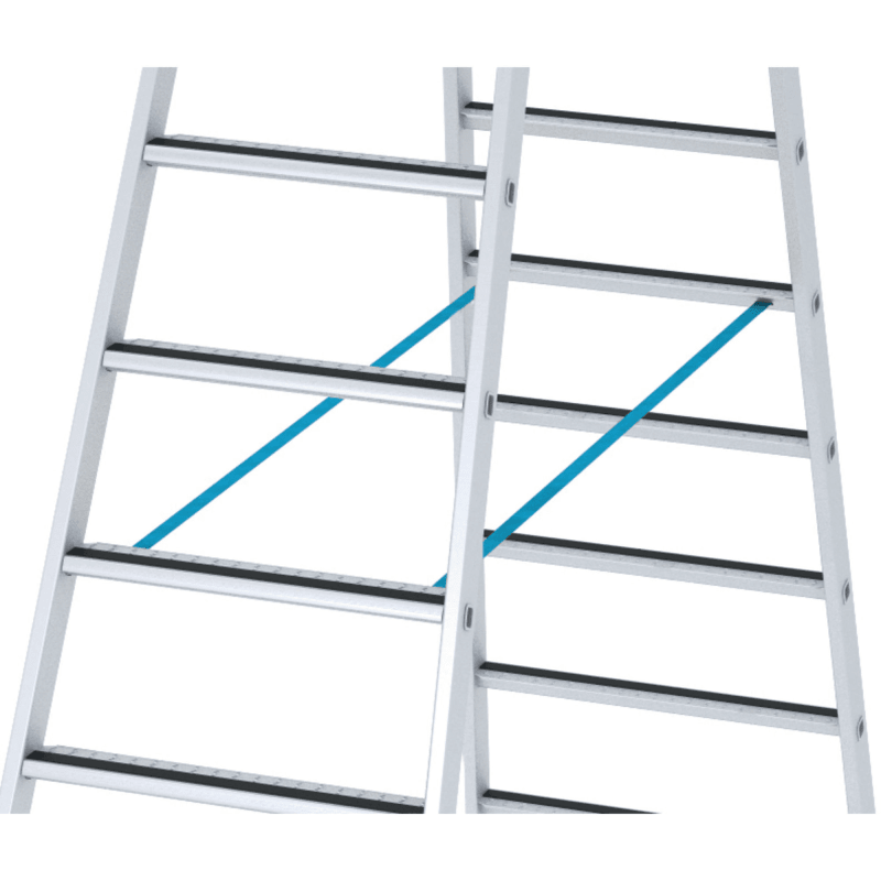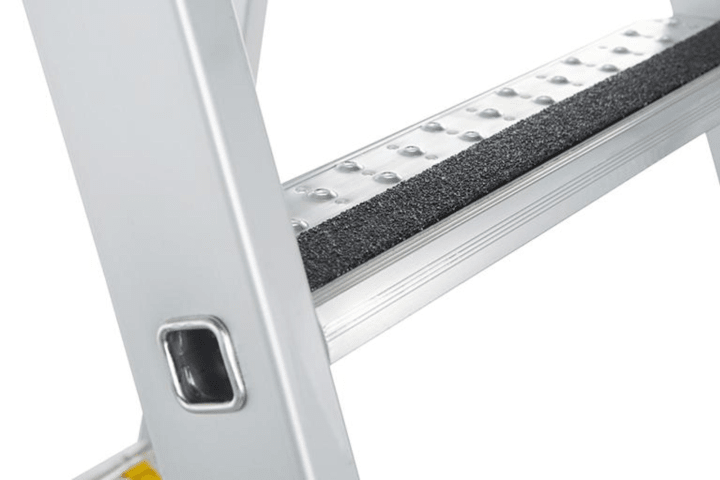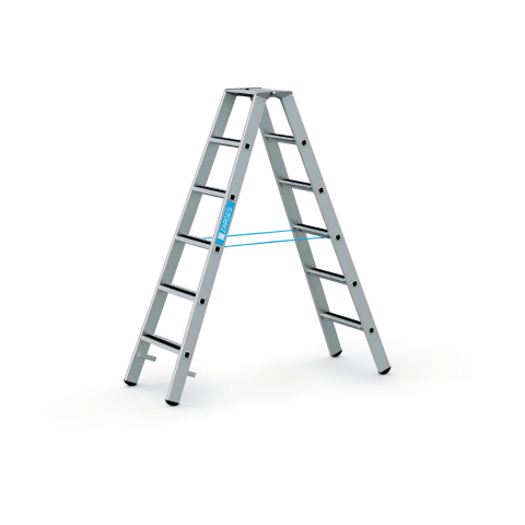 Stufenstehleiter, beidseitig begehbar, mit R13 step B • Material: Aluminium • Stufen-Holm-Verbindung: gebördelt • Scharniere aus Aluminium Druckguss • Holme: abriebfest, eloxiert • Stufen: geriffelt, 80 mm tief, rutschsicher, mit R13-Belag und Profilierung sowie Lochung zum Ablauf von Flüssigkeiten • Spreizsicherung: durch hochfeste Perlongurte • 2-Komponenten-Kunststoffschuhe: auswechselbar, für einen rutschsicheren Stand und zugleich festen Sitz im Holm • Belastung: max. 150 kg • Entspricht der Norm EN 131 professional