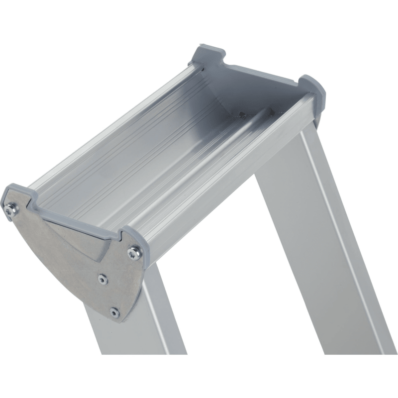 Stufenstehleiter, einseitig begehbar, mit R13 step S • Material: Aluminium • Stufen-Holm-Verbindung: gebördelt • Holme: abriebfest, eloxiert • Stufen: geriffelt, 80 mm tief, mit R13-Belag und Profilierung sowie Lochung zum Ablauf von Flüssigkeiten • Standplattform: aus Alu-Strangpressprofil (300 mm × 250 mm) mit R13-Belag für sicheren und bequemen Stand • Aluminium-Ablageschale: für Kleinteile und Werkzeug • 2-Komponenten-Kunststoffschuhe: auswechselbar, für einen rutschsicheren Stand und zugleich festen Sitz im Holm • Belastung: max. 150 kg • Entspricht der Norm EN 131 professional Hinweis: Höchster Rutschsicherheit dank R13-Stufen für ölige oder nasse Einsatzbereiche.