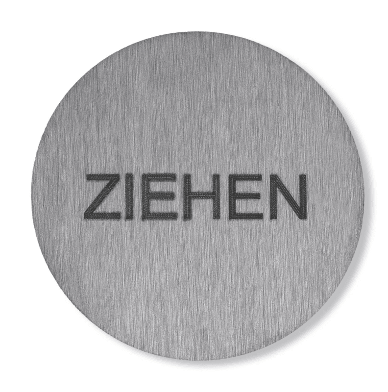 Das HEWI "Ziehen"-Symbol (Ø52 mm, 2 mm dick) ist selbstklebend und besteht aus Edelstahl.