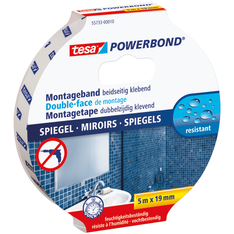 tesa Powerbond® Spiegel ist ein Montageband, das speziell für Spiegel und ihre typischen Einsatzorte entwickelt wurde. Das extra starke Spiegelklebeband lässt sich einfach und sauber anbringen und erm