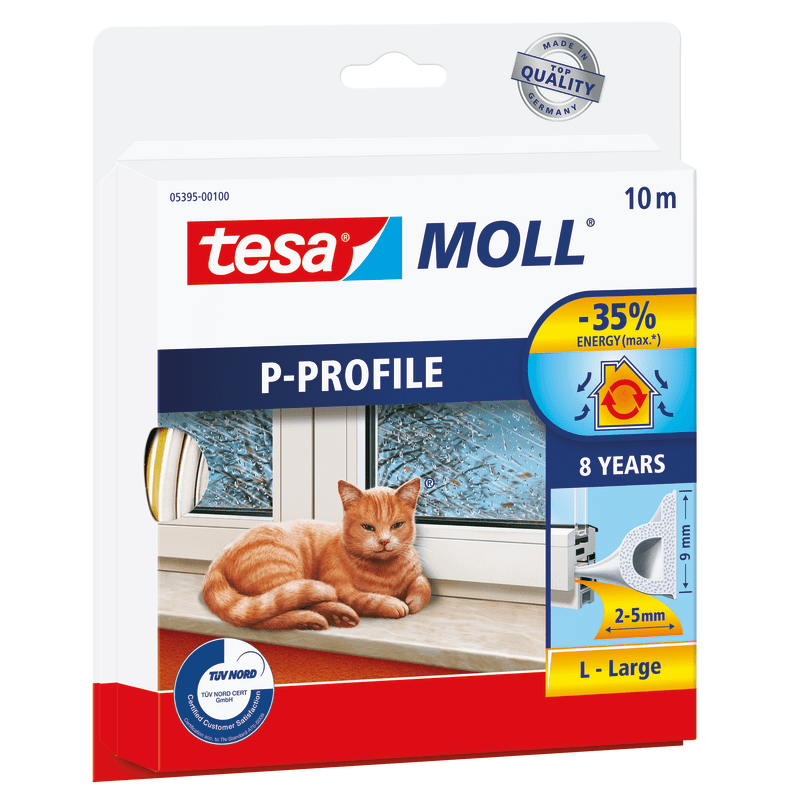 Das tesamoll® P-Profil aus Gummi eignet sich als Fensterdichtung oder Türdichtung und ist aufgrund des Hohlprofils in der Lage, größere Spalten von 2 - 5 mm zu schließen. Die Gummidichtung ist selbstklebend und lässt sich mit wenigen Handgriffen am Fenster- oder Türrahmen befestigen. Dank der überlegenen tesa®-Klebetechnologie beträgt die Mindestlebensdauer der Fensterdichtung vier Jahre. Zudem ist sie witterungs- und temperaturbeständig. Bei entsprechender Spaltabdeckung ist es mit der Gummidichtung möglich, bis zu 35% der Heizkosten einzusparen.
