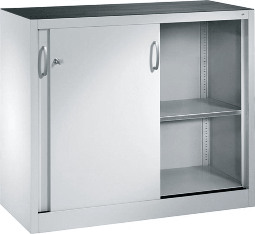Schiebetüren-Beistellschrank, Höhe 1200 mm • Langlebige Stahlkonstruktion • Türen: rollengelagert und leichtgängig • Material: Stahlblech mit hochwertiger Einbrennbeschichtung • Raster-Höhenverstellung: 15 mm • Mit Gummiriefenmatte • Schiebetüren leichtgängig laufend, mit Spezial-Rollen in stabiler Kunststoff-Schienenführung • Drehdruckzylinderschloss • Einlegeböden verzinkt, höhenverstellbar • Abdeckplatten auf Wunsch lieferbar • Standardlackierung: einfarbig RAL 7035 lichtgrau