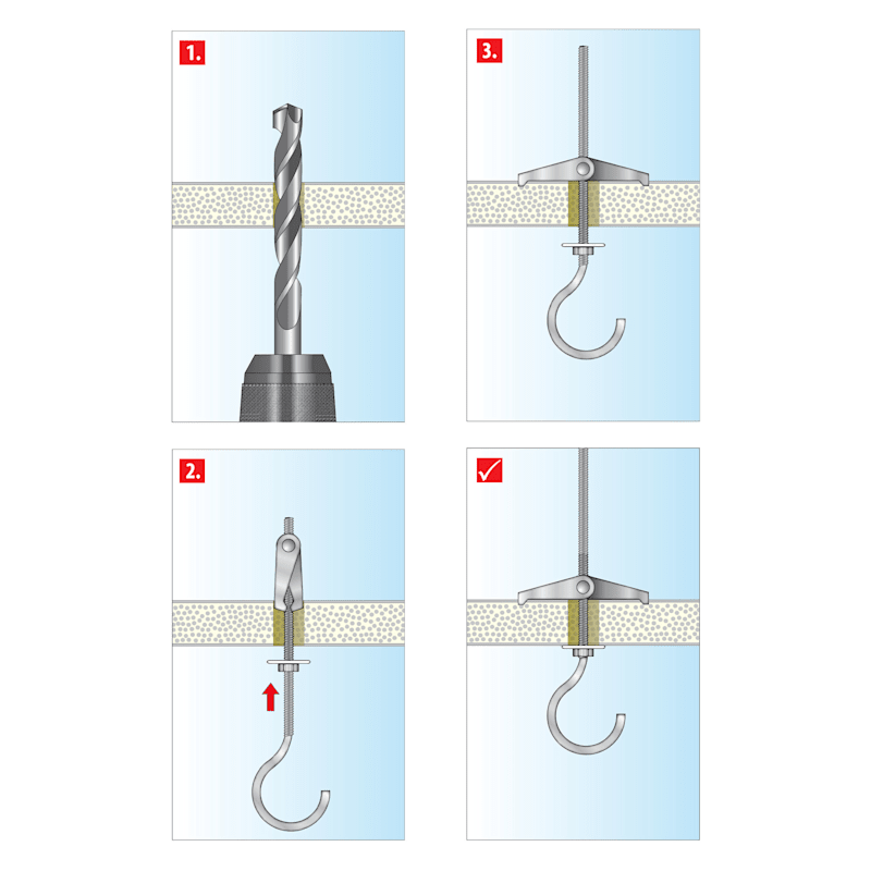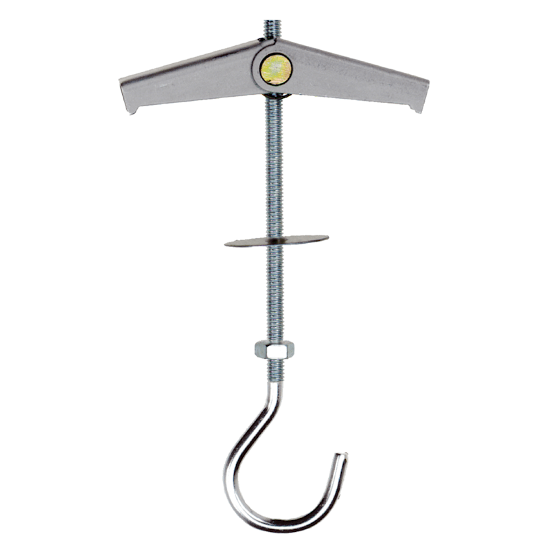 Der Kippdübel aus galvanisch verzinktem Metall kann sowohl als Decken- als auch Wandmontage bei ein- und zweilagigen Wandbauplatten verwendet werden. Der Klappdübel spreizt hinter den Wandbauplatten selbstständig und automatisch.