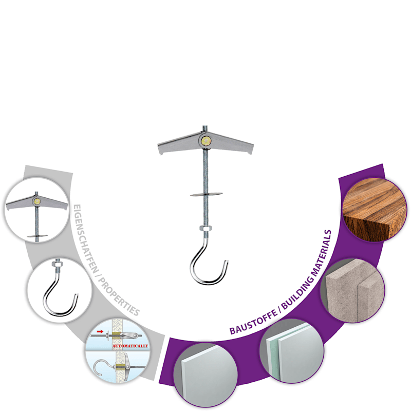 Der TOX Federklappdübel inklusive Unterlegscheibe und Rändelmutter eignet sich ideal zur schnellen und einfachen Montage bei Hohlräumen. Der Kippdübel aus galvanisch verzinktem Metall kann sowohl als