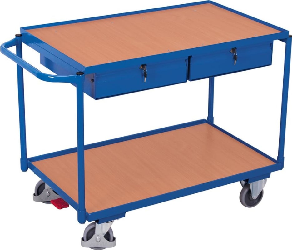 Tischwagen mit Schublade, Schiebegriff gerade • Stahlblech-Konstruktion: geschweißt, pulverbeschichtet in RAL 5010 enzianblau • Ladeflächen: Holzwerkstoff-Platten, Oberfläche Buchendekor, in Winkelstahlrahmen mit 15 mm hohem Rand • Beräderung: 2 Lenk-, und 2 Bockrollen, thermoplastische Gummibereifung in graublau, non-marking • Naben: Präzisions-Rillenkugellager • EasySTOP-Bremssystem: serienmäßig • Stahlblech-Schubladen: 2 Stück mit Rollenauszug und Zylinderschloss • Schubladen-Maße im Lichten H x B x T: 80 x 400 x 450 mm • Schubladen-Tragkraft: 25 kg
