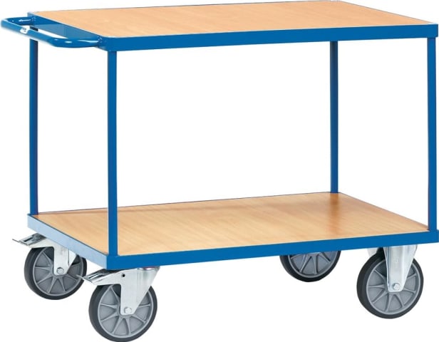 Schwere Tischwagen, 2 Ladeflächen • Stahlrohr-/Profilstahl-Konstruktion: geschweißt, pulverbeschichtet • Plattformen Holzwerkstoff-Platten, im Stahlrahmen liegend • Schiebegriff: gerade • Rollen: 2 Bockrollen, und 2 Lenkrollen mit Feststeller, gemäß der Europäischen Norm EN 1757-3 (Sicherheit von Plattformwagen) • Räder: TPE-Bereifung, leichtlaufend • Naben: Rillenkugellager