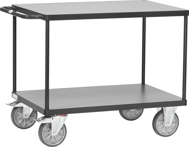 Schwere Tischwagen, 2 Ladeflächen • Stahlrohr-/Profilstahl-Konstruktion: geschweißt, pulverbeschichtet • Plattformen Holzwerkstoff-Platten, im Stahlrahmen liegend • Schiebegriff: gerade • Rollen: 2 B