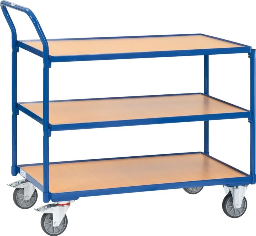 Leichter Tischwagen, 3 Ladeflächen, Schiebegriff hochstehend • Stahlrohr-/Profilstahl-Konstruktion: geschweißt, pulverbeschichtet • Schraubkonstruktion • Plattformen: Holzwerkstoff-Platten, im Stahlrahmen liegend, Randhöhe 12 mm • Schiebegriff: hochstehend • Rollen: 2 Bockrollen, und 2 Lenkrollen Ø 125 mm, mit Feststeller, gemäß der Europäischen Norm EN 1757-3 (Sicherheit von Plattformwagen) • Räder: TPE-Bereifung, leichtlaufend • Naben: Rillenkugellager