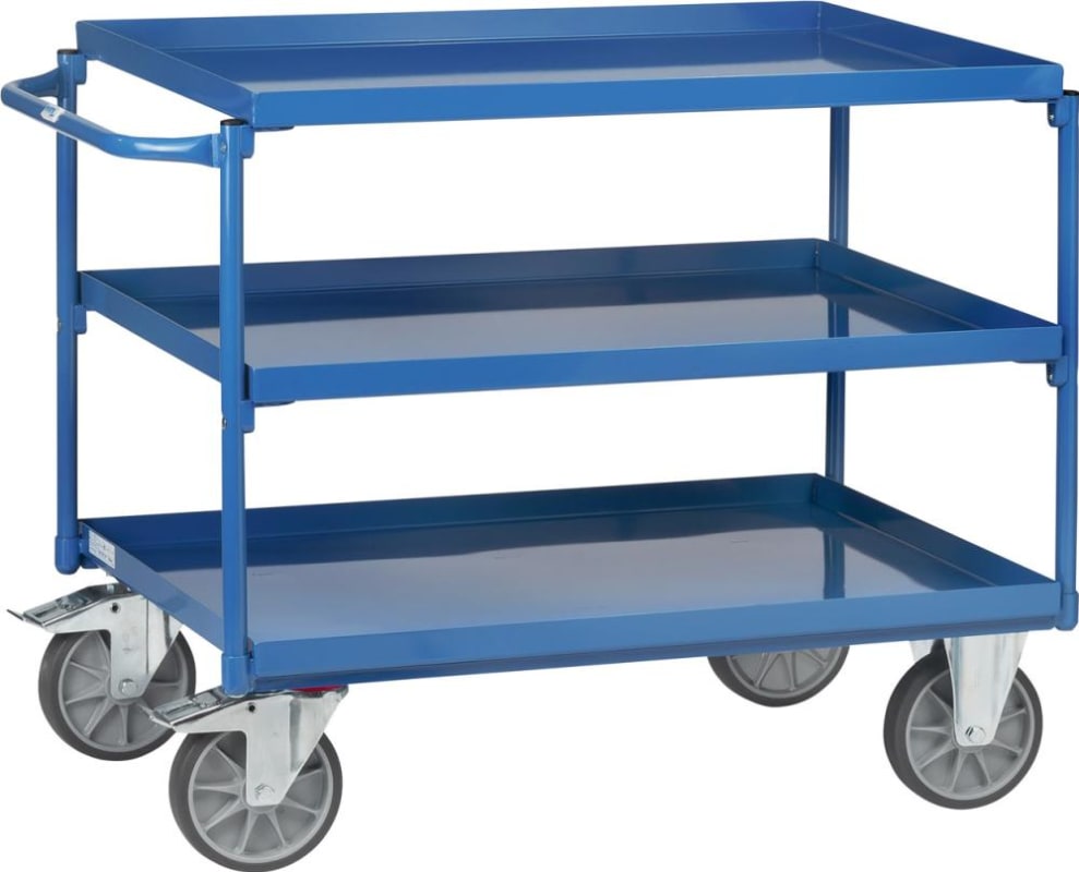 Tischwagen mit Wannen • Stahlrohr-/Profilstahl-Konstruktion: geschweißt, pulverbeschichtet • Stahlrohr-Bügel, Stahlblech-Wannen: verschraubt • Wannen: Öldicht, 40 mm hoch • Schiebegriff: gerade • Rollen: 2 Bockrollen, und 2 Lenkrollen mit Feststeller, gemäß der Europäischen Norm EN 1757-3 (Sicherheit von Plattformwagen) • Räder: TPE-Bereifung, leichtlaufend • Naben: Rillenkugellager