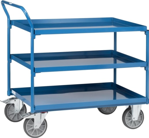 Tischwagen mit Wannen, Schiebegriff hochstehend • Stahlrohr-/Profilstahl-Konstruktion: geschweißt, pulverbeschichtet in RAL 5007 brillantblau • Stahlrohr-Bügel, Stahlblech-Wannen: verschraubt • Wanne