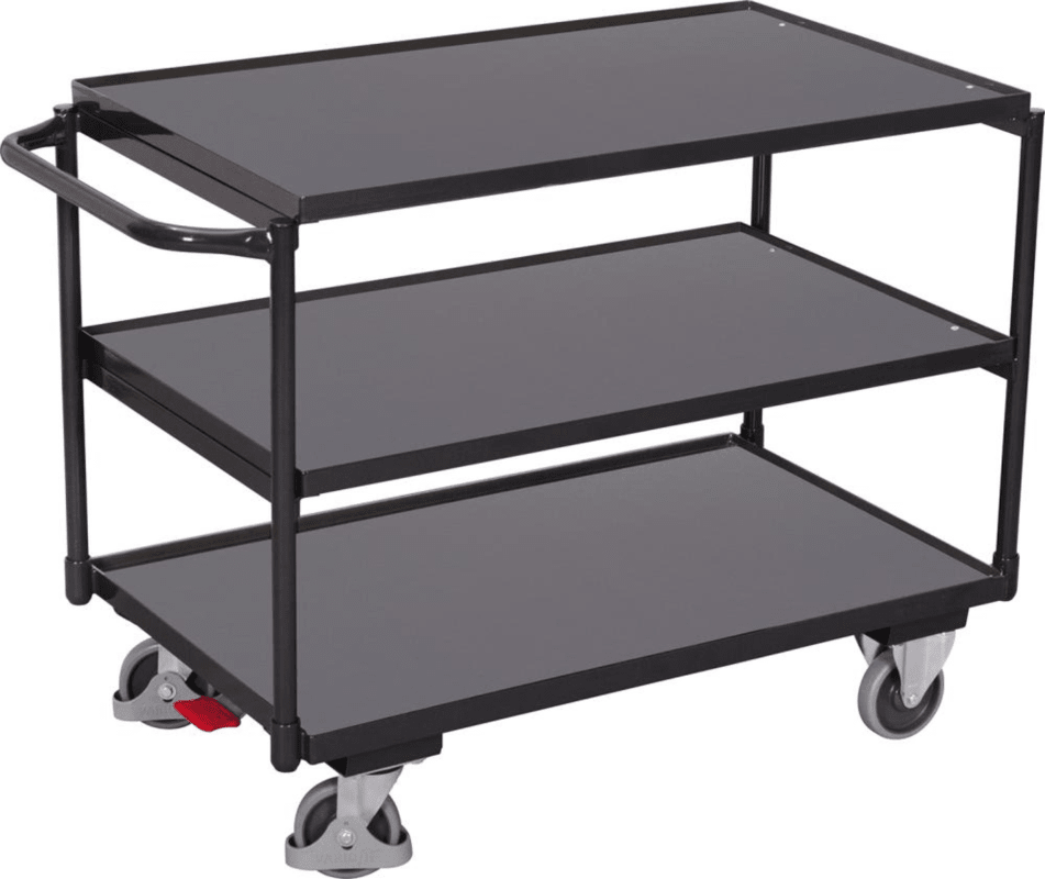 Tischwagen, Schiebegriff gerade • Stahlblech-Konstruktion: geschweißt, pulverbeschichtet • Ladeflächen: Holzwerkstoff-Platten, in Winkelstahlrahmen mit 15 mm hohem Rand • Beräderung: 2 Lenk-, und 2 B