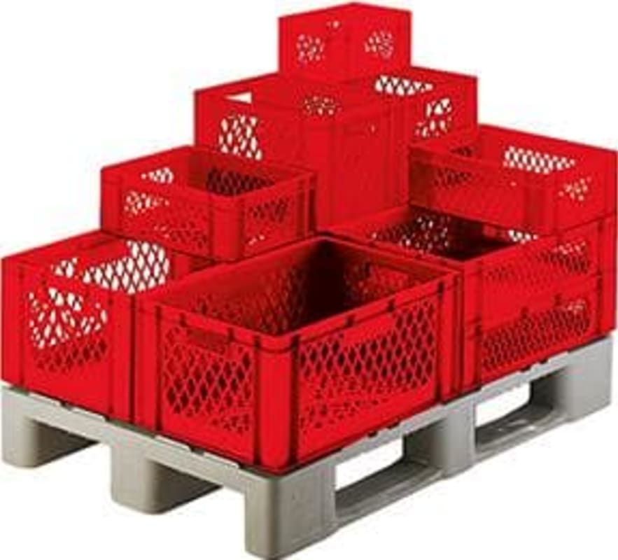 Transport-Stapelkasten, Wände und Boden durchbrochen • Material: Polypropylen • Entspricht den Bestimmungen des Lebensmittelgesetzes • Für den Einsatz auf Rollenbahnen • Wände und Boden durchbrochen • Passend zu Palettengrößen B x L: 800 x 1200 mm • Hohe Stabilität • Temperaturbeständigkeit: –20 °C bis +60 °C • Medienbeständigkeit: viele Säuren und Laugen