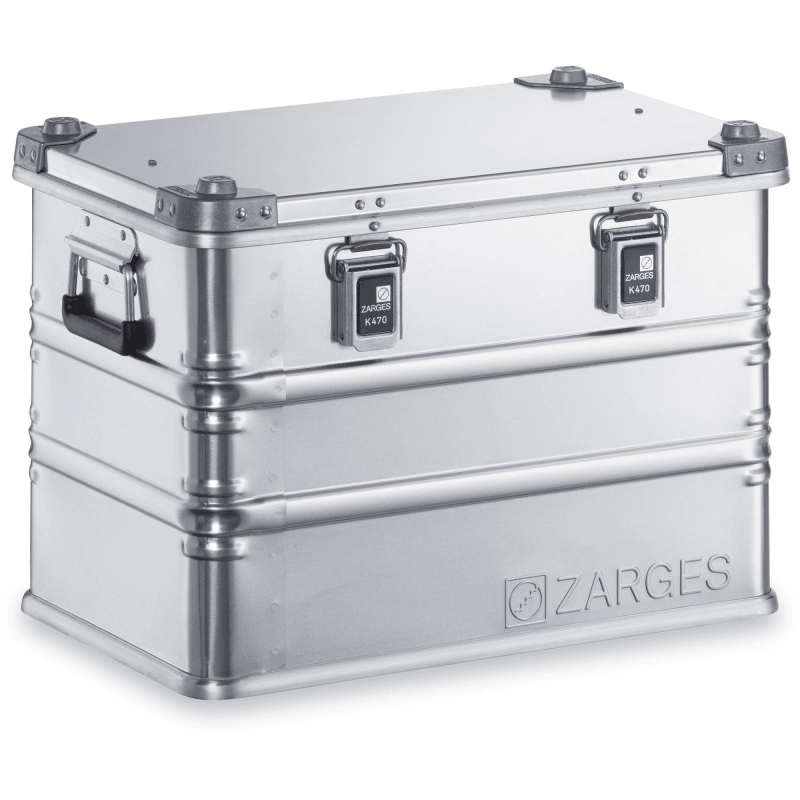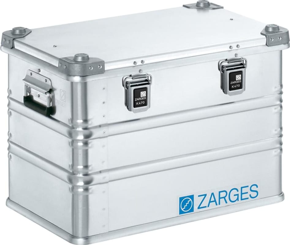 ZARGES K 470 Universalkiste: Die Baureihe K 470 bietet mit 25 Größen eine einzigartige Auswahl an Standardgrößen. Das Fassungsvermögen reicht von 13 l bis 829 l. Individuelle Sondergrößen möglich. -Deckel mit Edelstahlscharnierband, zwei Gurtbändern und umlaufend eingeschäumter Dichtung im Deckel. -Sichere Stapelbarkeit durch Stapelecken aus Aluminiumguss. -Hohe Stabilität durch 3 vollverschweißte Aluprofilrahmen. -UN-Zulassung für den Transport gefährlicher Güter gegen Mehrpreis möglich. -ZARGES Comfort-Handgriffe für ergonomische Handhabung und Belastungen bis 50 kg. -Je nach Höhe umlaufende Sicken und Ecksicken für zusätzliche Formstabilität. -Klappverschlüsse: Sicherung durch Steckschloss, Plomben, Aufspringsicherungsfeder oder Vorhängeschloss (max. Bügelstärke 6 mm) möglich. -25 Standardgrößen, kundenspezifische Ausführungen auf Anfrage. -Ergonomische und langlebige Comfort-Verschlüsse für mindestens 20.000 Betätigungszyklen. -Extra starkes 1,5-mm-Blech bei allen K 470 ab 750 x 550 mm Grundmaß.