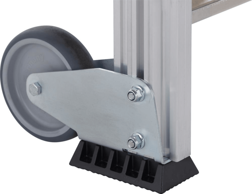 Treppenpodest • Material: Aluminium • Stufen- und Plattformbelag: serienmäßig aus Aluminium gerieft (R10), rutschsicher • Neigung: 45°, für bequemen Aufstieg • Mit Rollen am Stützteil • Schnelle und