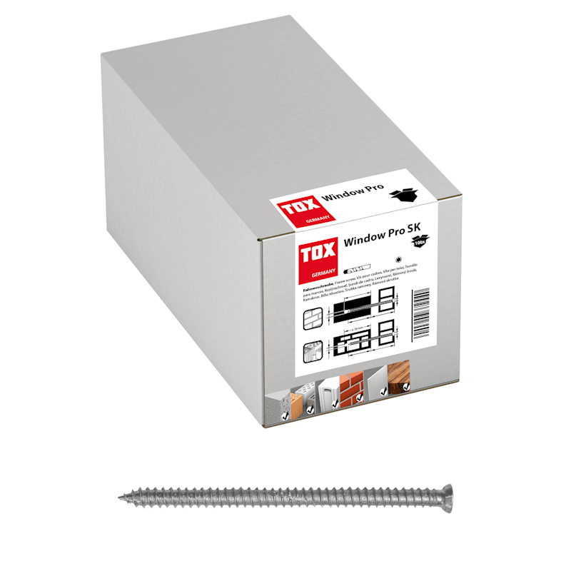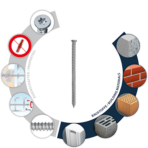 Vorteile: Montage ohne zusätzlichen Dübel. Schnelle Montage durch geringen Bohrerdurchmesser. Spannungsfreie Abstandsmontage durch den Gewindeeingriff im Rahmen und Baustoff