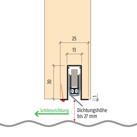 TÜRDICHTUNG PLANET RF RD/42 Dichtungshöhe bis q 27 mm Bei optimaler Abdichtung Schalldämmwert bis 44 dB Für wellige, bucklige, hohle, schräge und wellige Böden Weiche Silikon-Schräglippendich