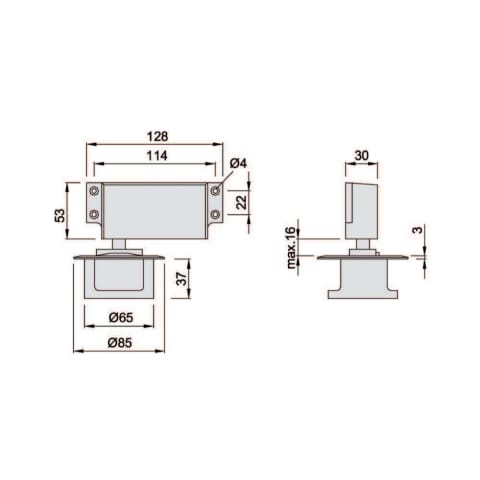 KWS Türfeststeller 1004; Ausführung: mit Dauermagnet; Material: Aluminium; Einsatzbereich: Objekttür; Basis: Türfeststeller; Befestigungsart: zum Aufschrauben; Breite: 85mm; Länge: 128mm; Abzugskraft: