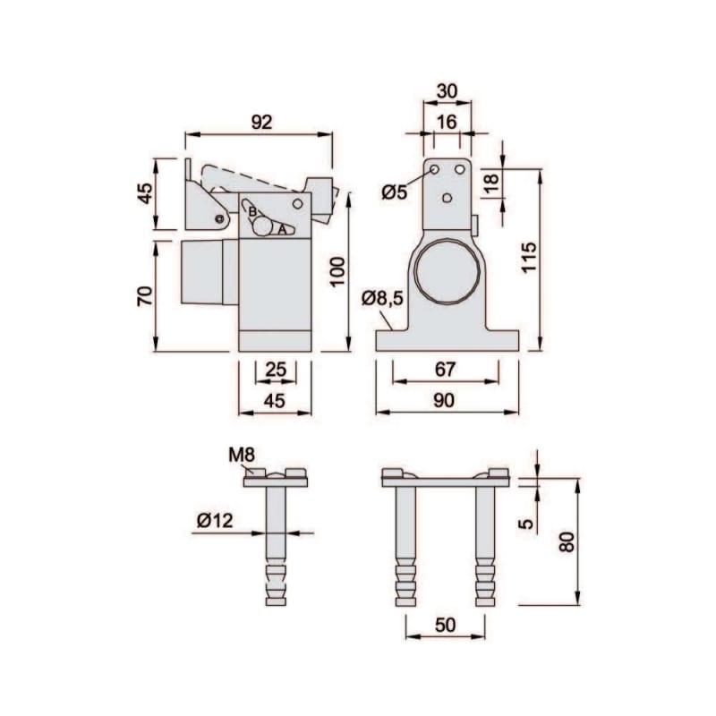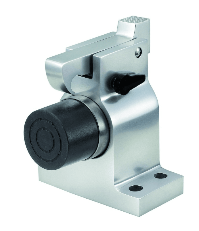 KWS Türfeststeller 1009; Ausführung: Haken mit Feststellvorrichtung,mit Steindolle,mit federndem Gummipuffer; Material: Aluminium; Material Rollkloben: Stahl; Farbton Rollkloben: stahl; Einsatzbereich