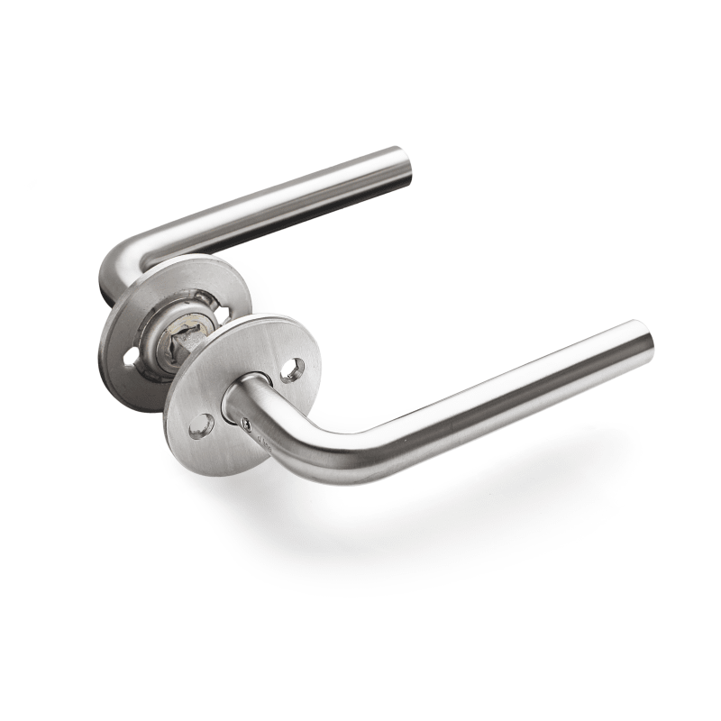 Knud Holscher Kollektion, Drücker 14L Paar, 8x8mm, massive Rosette, cc 30mm, 33-59mm. Hergestellt aus hochwertigem, rostfreiem Edelstahl AISI 316, der vor starker Korrosion schützt. Einzigartiges Kugellagersystem für eine außergewöhnlich lange Lebensdauer. Zertifiziert nach EN 1906 bis 47-B1140U. 20 Jahre Garantie.