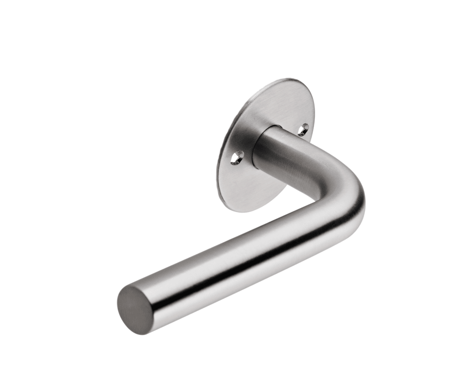 BASE Kollektion, Drückerpaar 16L, 8x8mm, massive Rosette, cc 30mm, 33-59 mm aus satiniertem Edelstahl AISI 304. Zertifiziert nach EN 1906 bis 47-B1140U. 10 Jahre Garantie.