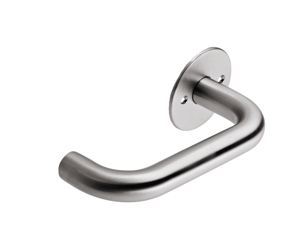 BASE Kollektion, Drückerpaar 16U, 8x8mm, massive Rosette, cc 30mm, 33-59 mm aus satiniertem Edelstahl AISI 304. Zertifiziert nach EN 1906 bis 47-B1140U. 10 Jahre Garantie.