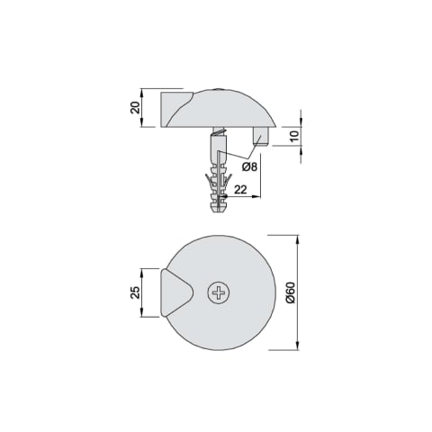 KWS Bodentürstopper 2003; Material: Aluminium; Befestigungsart: sichtbar verschraubt; Befestigungstechnik: mit Verdrehsicherung; Befestigungssystem: Bodenmontage; Basis: Bodentürstopper; Farbton: silberfarbig; Farbe Gummipuffer: schwarz; Oberfläche: eloxiert,geschliffen,poliert; Lieferung: mit Montagezubehör; DIN-Richtung: links/rechts verwendbar; Durchmesser: 60mm; Zapfendurchmesser: 8mm; Höhe: 20mm; Zapfenlänge: 10mm; Durchmesser Dübel: 8mm; Türart: Innentür; Türgewicht max.: 40kg; Breite Gummipuffer: 25mm