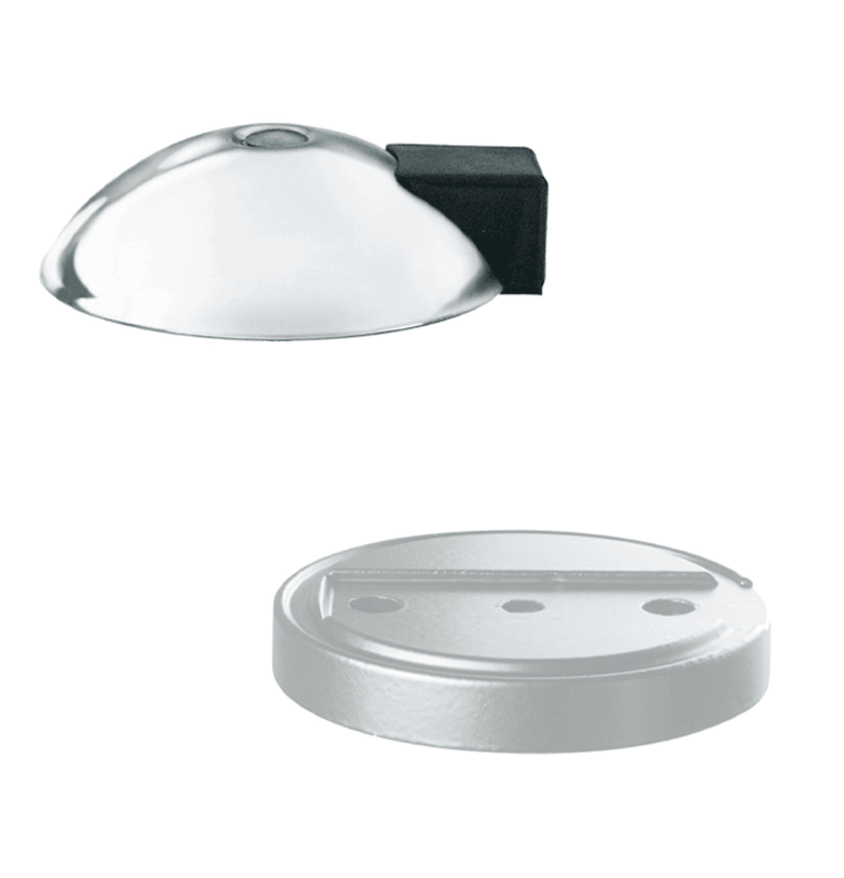 Bodentürpuffer aus Metall mit schwarzem Gummipuffer.