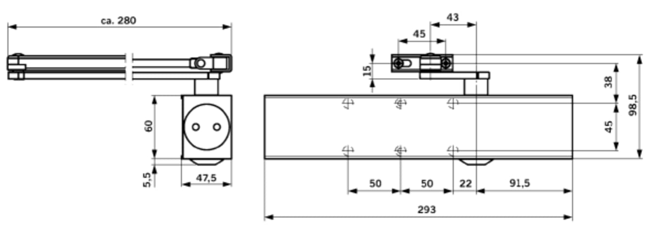 Türschließer nach EN 1154 A, mit Gestänge, DIN links und rechts verwendbar. Schließkraft stufenlos einstellbar, Größe EN 2 - 6, maximale Türflügelbreite 1400 mm, EN 7 maximale Türflügelbreite 1600 mm.