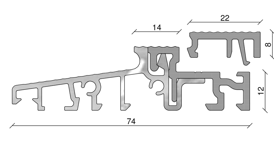 System "COMBI": Aluminium-PVC-Türschwelle, geriffelt, mit Schutzfolie, 74 mm Bautiefe, ohne Wärmebrücke, mit Schließblechleiste, Maße: 74 x 20 x 4500 mm