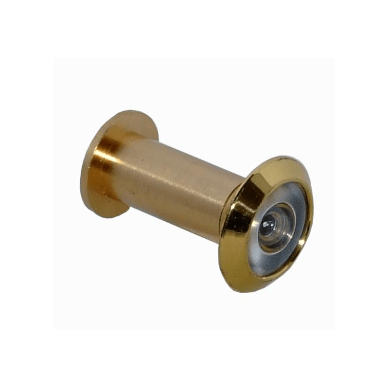 Türspion, Material: Messing. Blickwinkel 200°, für Türstärken von 35 - 60 mm, 14 mm Bohrung. Außenseite: 28 mm Durchmesser. Innenseite: 17,5 mm Durchmesser.