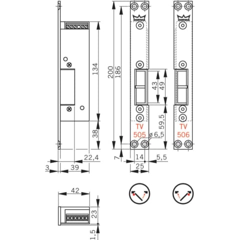 Türverriegelung mit Flachschließblech, für den verdeckten Zargeneinbau. Auch als Fluchttüröffner zu verwenden. Integrierte Rückmeldekontakte zur Überwachung auf aktiven/inaktiven Zustand. Für Falz und Stumpftüren. Max. Zuhaltekraft gemäß „Richtlinie über elektrische Verriegelungssysteme von Türen in Rettungswegen“ (EltVTR). Anschluss an das Türmanagementsystem DORMA TMS über Verriegelungsadapter TV 50x DCW®. Der Verriegelungsadapter kann auch direkt in das Türterminal TL-G NT 320 V oder in die Rettungswegzentrale RZ TMS 2 eingebaut werden. Maße Flachschließblech: 25 x 200 x 3 mm