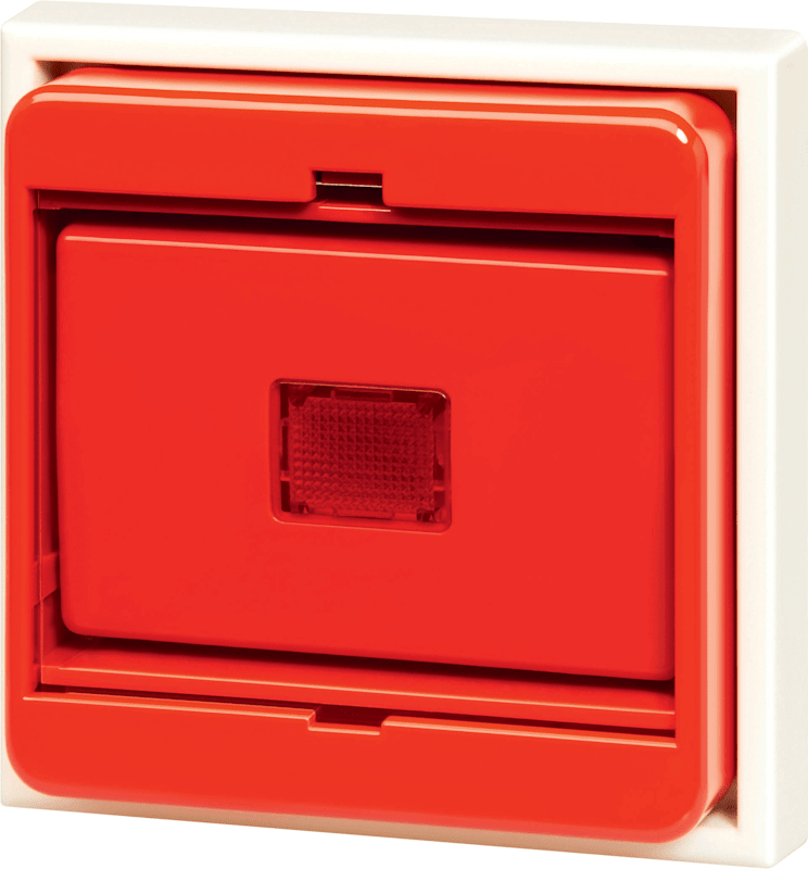 Unterputz-Unterbrecherschalter/ -taster mit rotem Rahmen und rotemBetätigungsfeld unter Schutzglas mit Beleuchtung. Mit Beschriftungs-Etiketten z. B. Notschalter, Heizung, Hausalarm usw.