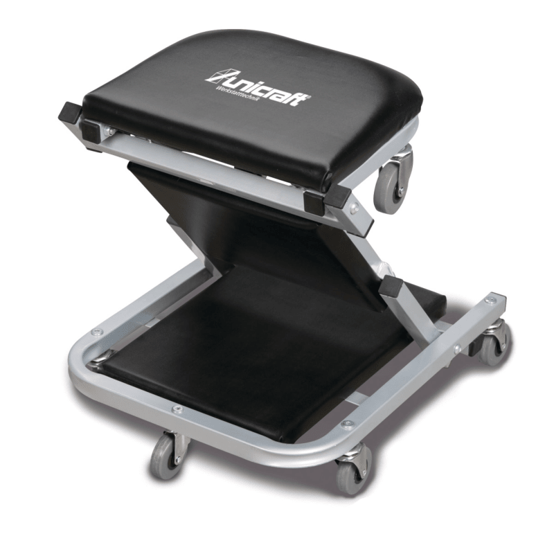 Robuste Stahlkonstruktion mit gepolsterter Liege-/Sitzfläche und sieben Lenkrollen
