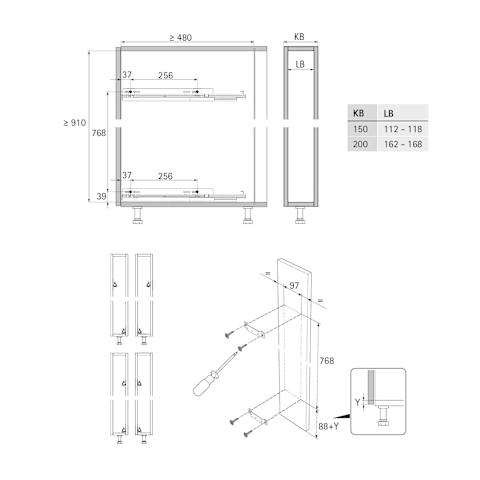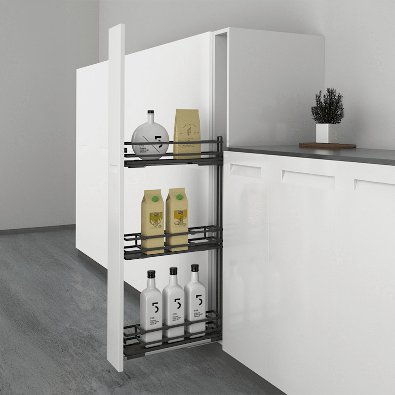 • Frontauszug 3-etagig für höhere Unterschränke oder in Kombination mit Frontauszug Lario 2-etagig für schmale Hochschränke• Für Schrankbreite 150 mm und 200 mm• Tablare mit HDF Boden (5 mm) und Fl