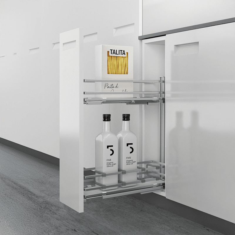 • Frontauszug 2-etagig für Unterschränke• Für Schrankbreite 150 mm und 200 mm• Tablare mit HDF Boden (5 mm) und Flachdraht-Reling• Passend für Quadro V6 Vollauszug, Nennlänge 470 mm (bitte separat