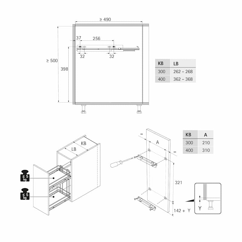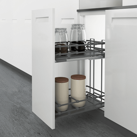 • Frontauszug 2-etagig für Unterschränke• Für Schrankbreite 300 mm und 400 mm• Tablare mit HDF Boden (5 mm) und Flachdraht-Reling• Passend für Quadro V6 Vollauszug, Nennlänge 470 mm (bitte separat