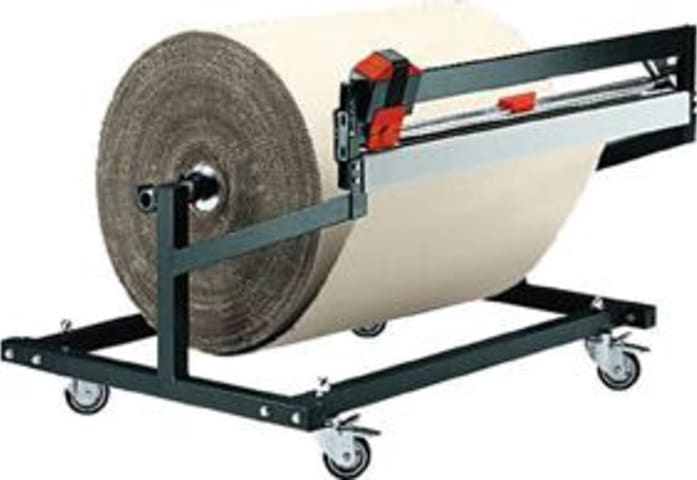 Schneidständer, Untertischgerät, fahrbar • Stahlrohr-Gestell • Das Schneiden in waagerechter oder senkrechter Richtung ist problemlos möglich • 2 Messerkassetten: 1 Kassette mit Rundmesser für Pappe/Papier, 1 Kassette mit Klinge für Folien • Austrittshöhe des zu schneidenden Werkstoffs: 580 mm Hinweis: Zum Schneiden von Rollen-Materialien wie Papier, Folie oder Wellpappe. Sowohl allein als auch in Kombination mit dem Packtisch-System nutzbar.