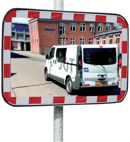 Verkehrsspiegel • Material: Acryl, schlagzäh, gem. DIN ISO 179-1 (ca. 70 % schlagfester als Glas) • Mit rot-weißer Reflexfolie (vermindertes Unfallrisiko) • UV-beständig • Halterung: mit 2 Fixpunkte