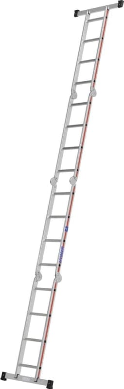 Vielzweckleiter • Material: Aluminium • Sprossen: aus Walzprofil • Stahl-Bügelgelenke, automatisch einrastend (Gelenke müssen auber gehalten werden und regelmäßig geschmiert werden) • Traverse • Als
