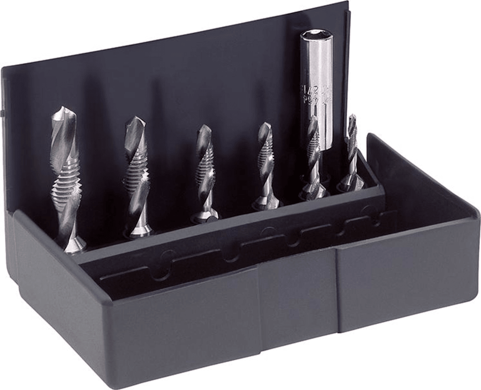 Kombi-Bit-Satz• Metrisches ISO-Gewinde DIN 13 • HSS-G • Toleranz ISO 2 6H • Durchgangsloch • Zum Kernlochbohren, Gewindeschneiden und Entgraten in einem Arbeitsgang • Mit 1/4"-6-kant-Schaft • Ma