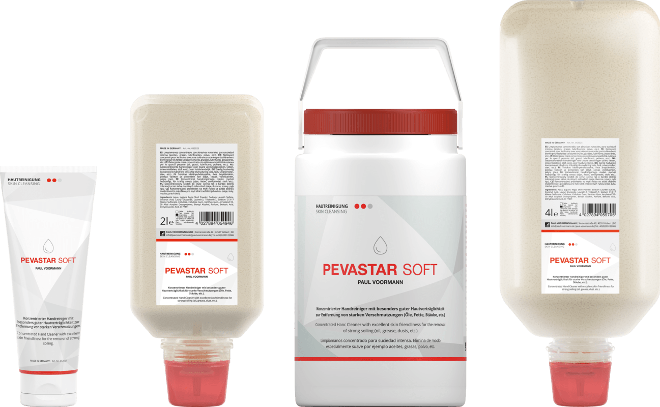 PEVASTAR SOFT entfernt effektiv starke Verschmutzungen wie z.B. Öle, Fette, Schmierstoffe, Stäube,verschiedene Farben, Druckfarben etc.reinigt porentief und besonders hautschonend, mit naturbasierter