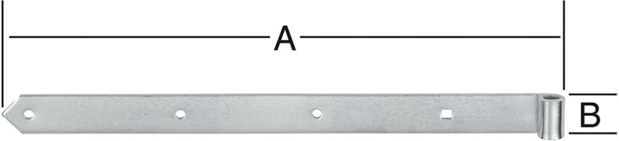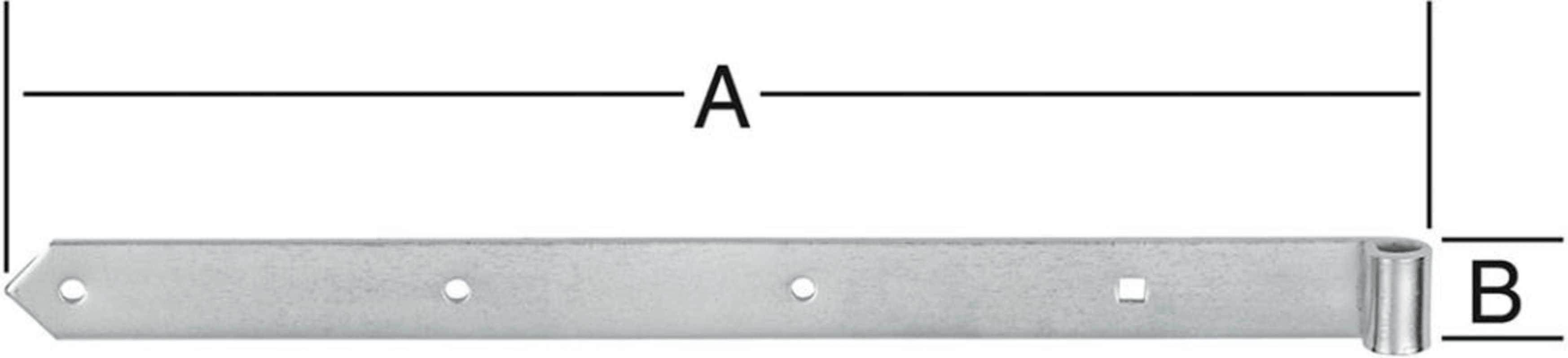 VORMANN Ladenband; Ausführung: schwer; Material: Stahl; Oberfläche: verzinkt; für Dornstärke: 16 mm; Basis: Ladenband; Form: spitz; Befestigungsart: zum Anschrauben; Einsatzbereich: Tor; Länge: 800 mm; Breite: 44 mm; Stärke: 5 mm; Vierkantlochung: 9 x 9 mm; Anzahl Rundlöcher: 4 St.; Rundlochdurchmesser: 8 mm; Schraublochausführung: Rundkopf; Anzahl Vierkantlöcher: 1 St.
