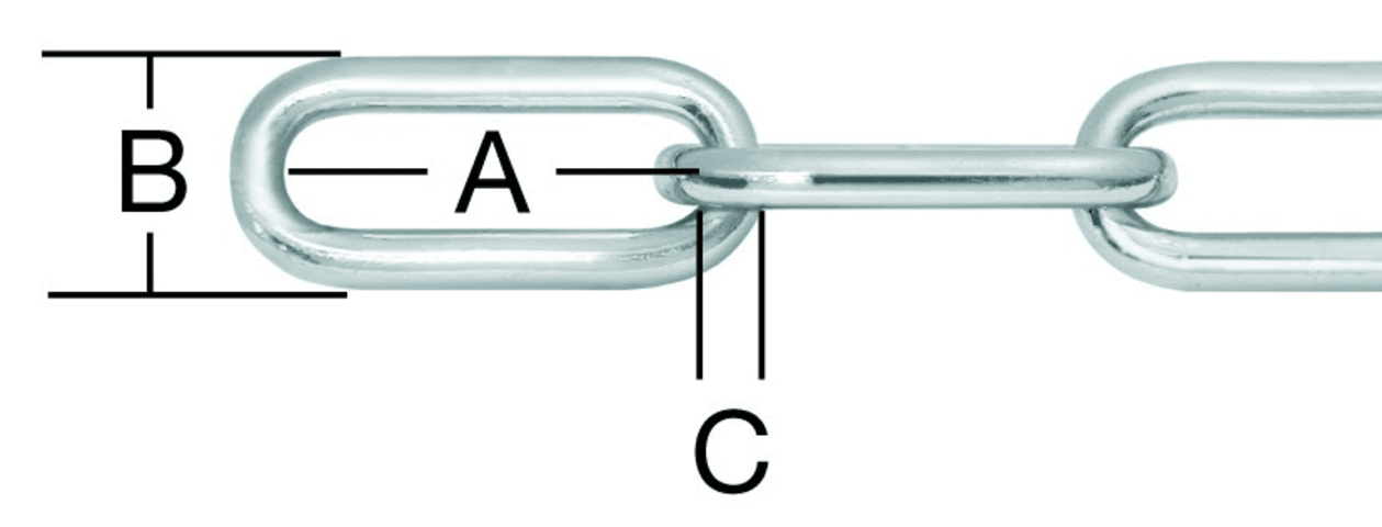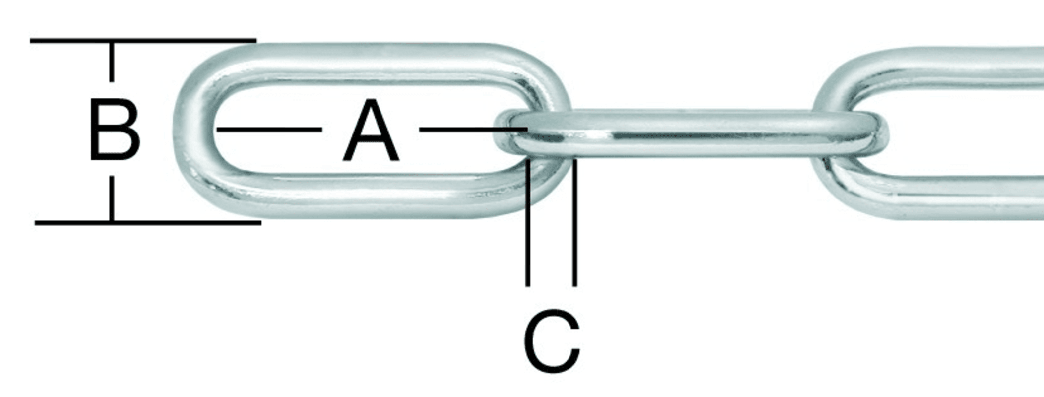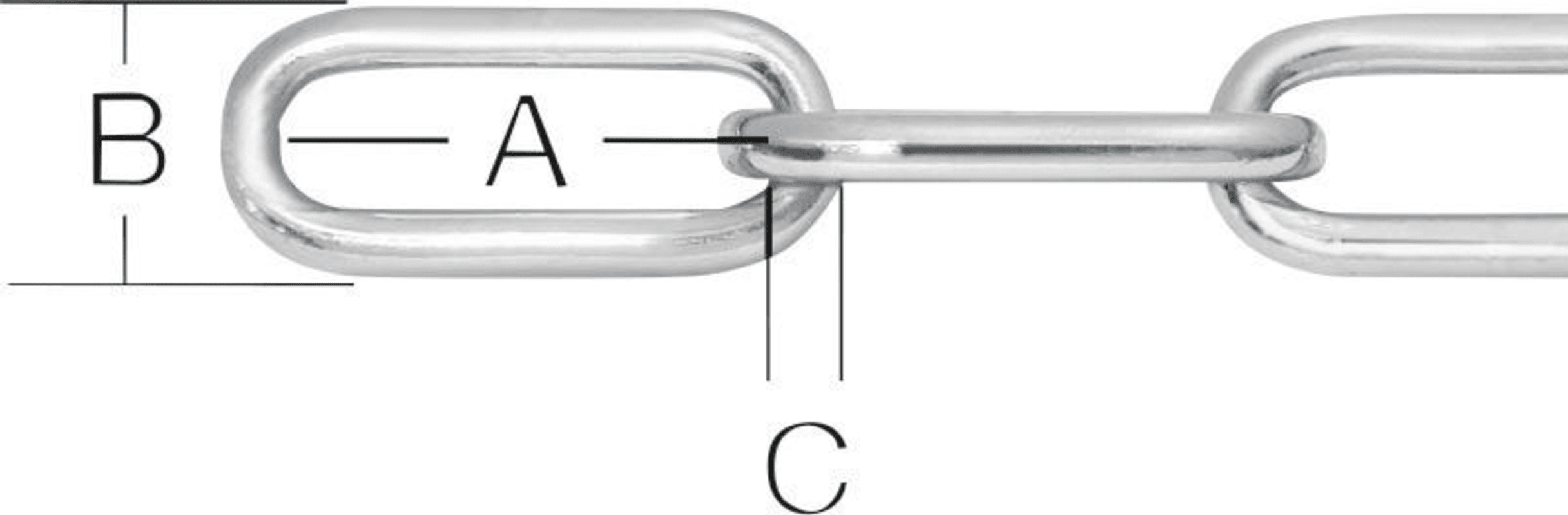 VORMANN; Typbezeichnung: Gliederkette; Ausführung: gerade C-Glieder, geschweißt; Norm: DIN 5685; Werkstoff: Stahl (ST); Oberfläche: galvanisch verzinkt; Nenndicke: 5 mm; Breite außen: 19 mm; Gewicht: 11,3 kg/m; Tragfähigkeit: 170 kg; Gesamtlänge: 30 m; Länge (Innen): 35 mm