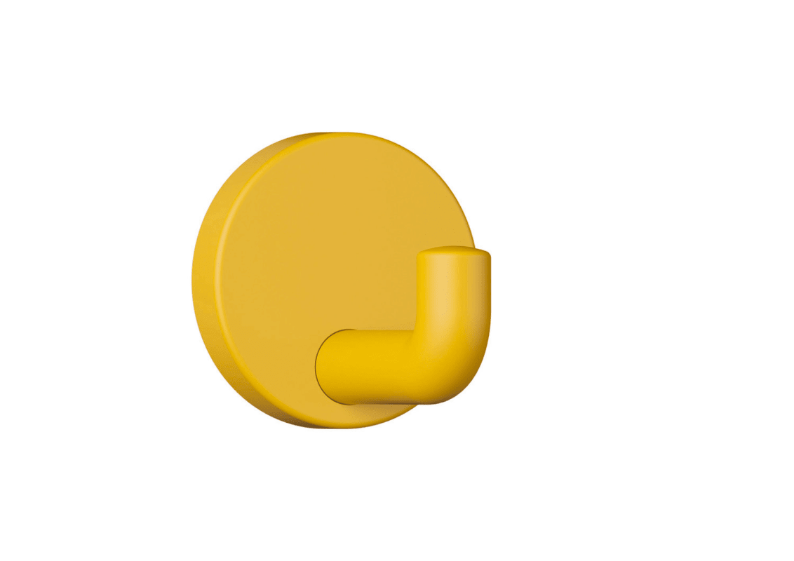 HEWI Haken 477.90B045; Ausführung: mit Rosette; Material: Kunststoff; Befestigungsart: verdeckt verschraubt; Einsatzbereich: Wand; Farbe: gelb; Farbton: senfgelb; Tiefe: 65 mm; Oberfläche: matt; Roset