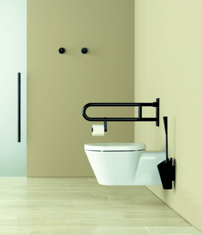 Wandhaken der Serie 477. Rechtwinklig gebogener, zylindrischer Haken mit Befestigungsrosette. Der Haken dient zum Aufhängen von Kleidungsstücken und anderen Utensilien. Leicht zu reinigen. Diebstahlge