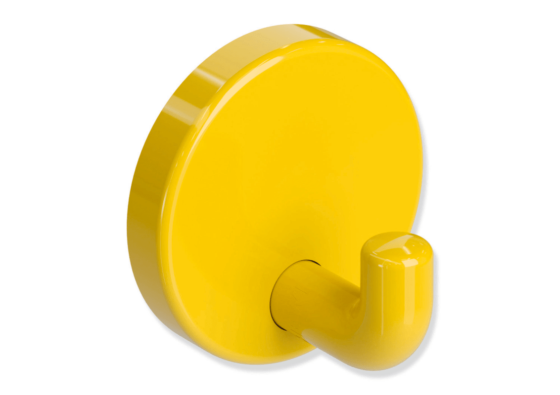 HEWI Haken 801.90.010; Ausführung: mit Rosette; Material: Kunststoff; Befestigungsart: verdeckt verschraubt; Einsatzbereich: Wand; Farbe: gelb; Farbton: senfgelb; Tiefe: 30 mm; Oberfläche: hochglanz;